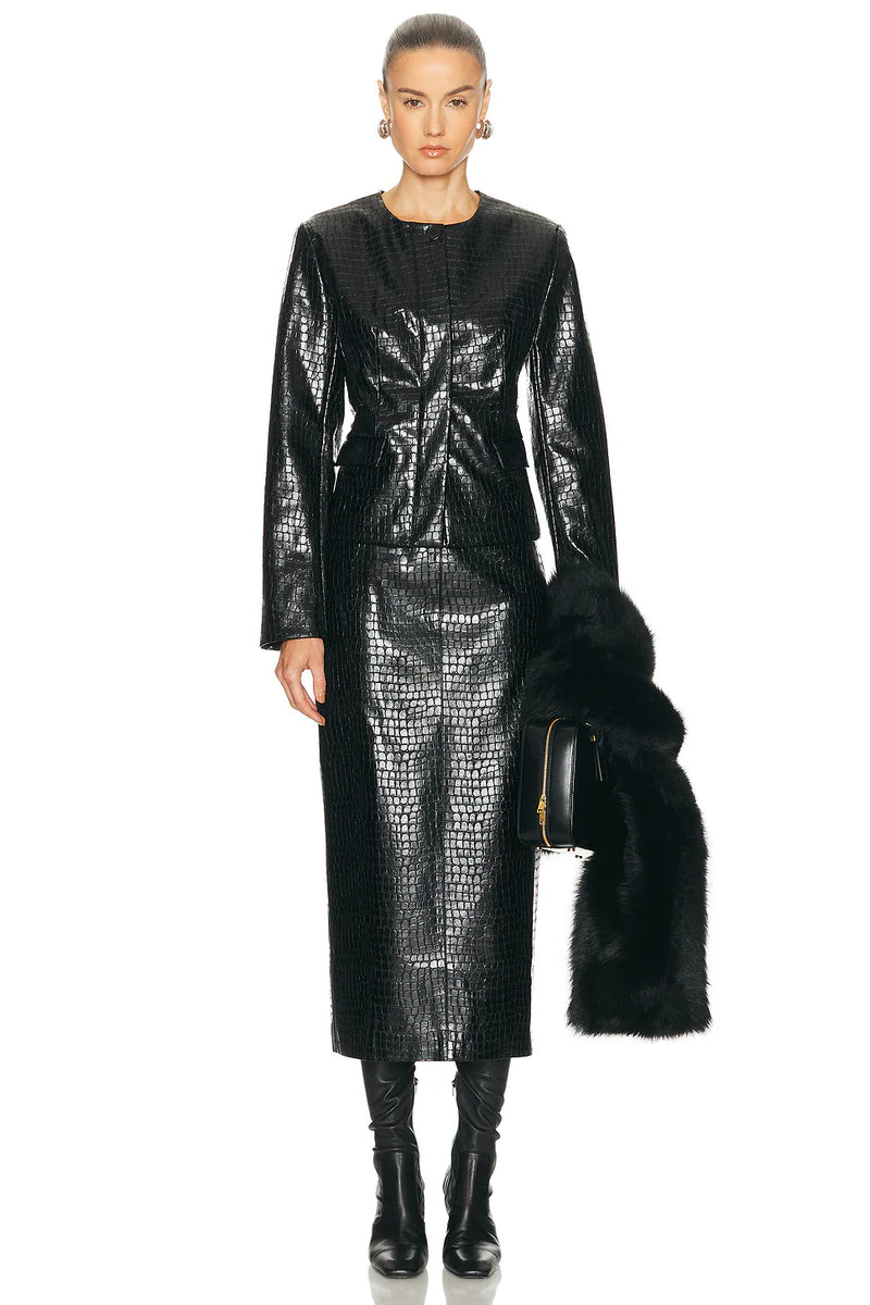 Best (faux) leather skirt for spring: L’Academie by Marianna Alisson Midi Skirt in Black, $219. Makes a statement out of any outfit you’d normally pair with black